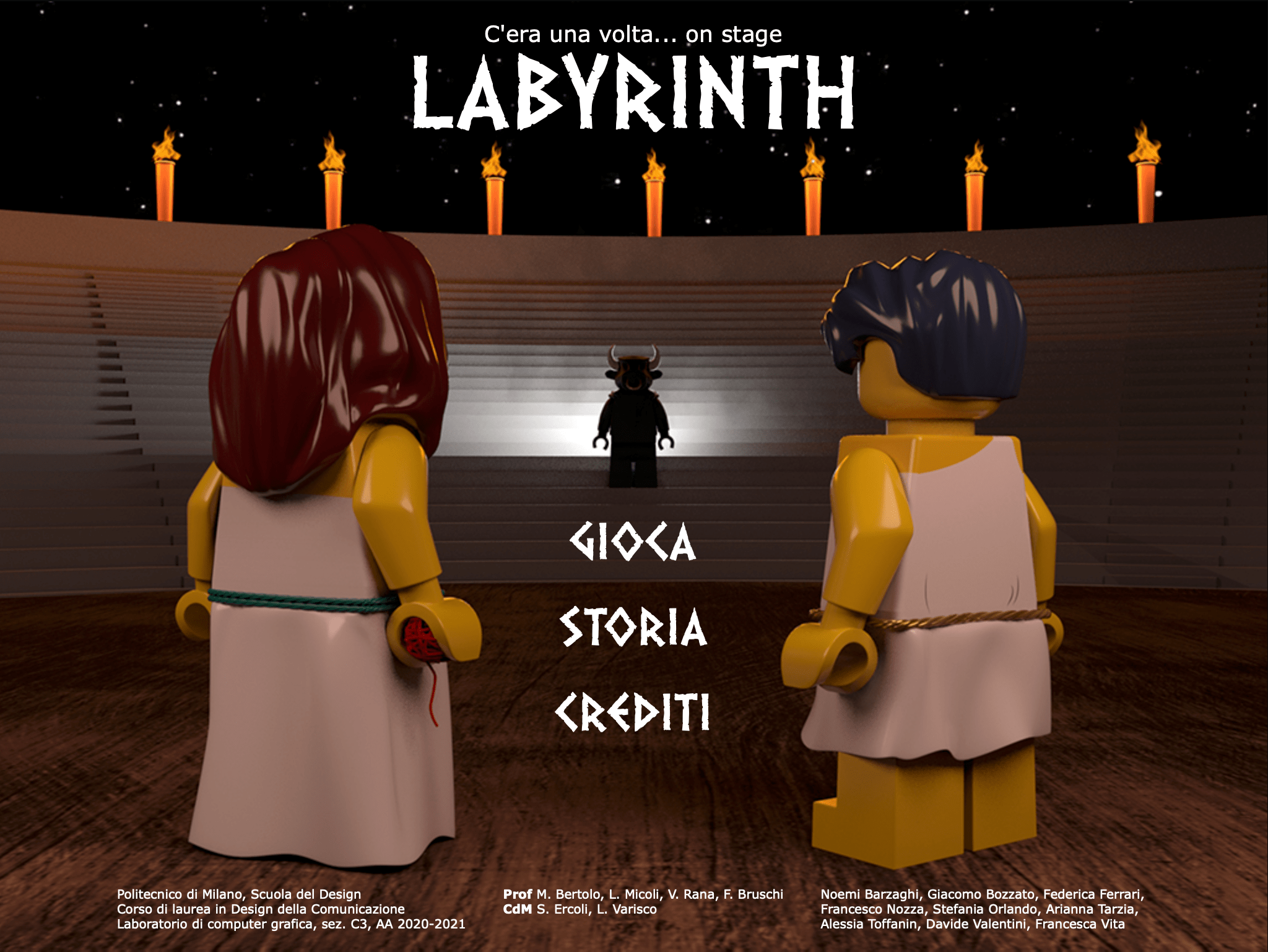 My teammates and I developed a videogame based on the greek myth of Ariadne, Theseus, and the Minotaur. It consists of a platform game and a series of 3d renderings that illustrate the story.